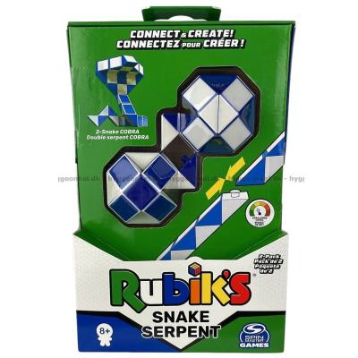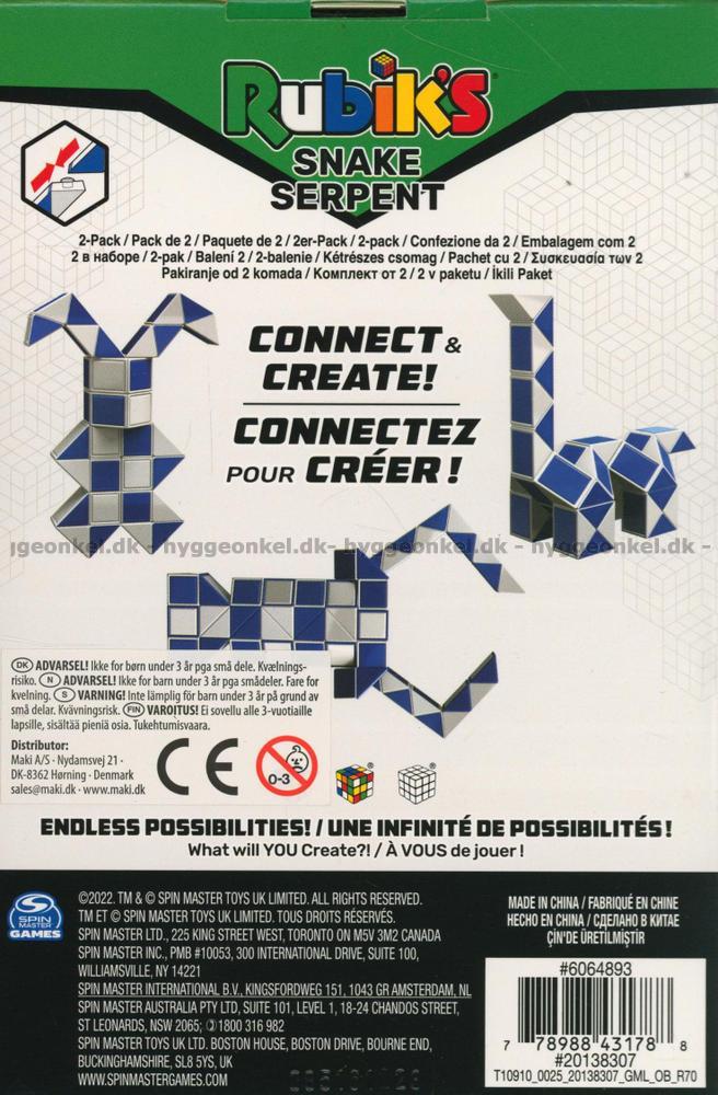 Här får du originalet Rubiks Connector Snake. Varje fält är cirka 1,5 x 2 cm. Asken innehåller två ormar som kan kopplas samman till en stor.