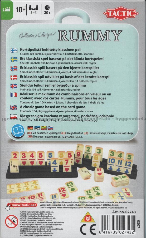 104 brickor, 4 jokerbrickor, 4 hållare. Brickorna är i papp och mäter 4 x 2 cm.