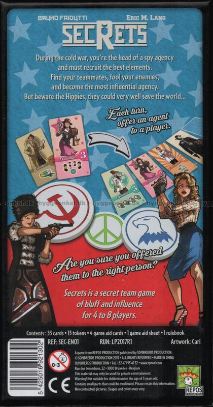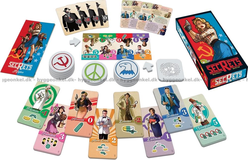I Secrets, som är det andra samarbetet mellan spelutvecklarna Eric Lang och Bruno Faidutti, blir spelarna fördelade på två hemliga lag - CIA eller KGB - och ska försöka samla in så många poäng till respektive lag som möjligt. Dessutom är en eller två av spelarna Hippies, som hatar Systemet och går sin egen väg. Deras mål är att kämpa för mannen på gatan och få minst antal poäng.
