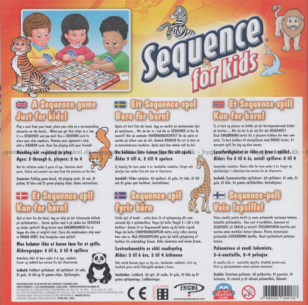 Notera! På kartongen finns att läsa att åldersgruppen är 3-6 år. Jag väljer att vara lite skeptisk till att en treåring har så god förmåga till strategisk överblick att han/hon får utbyte av spelet. För barn från 4-5 år och uppåt är Sequence for Kids dock ett utmärkt spel.