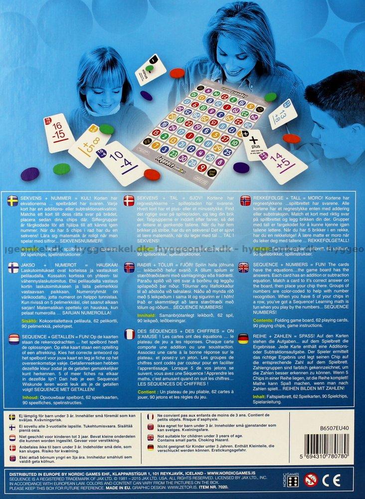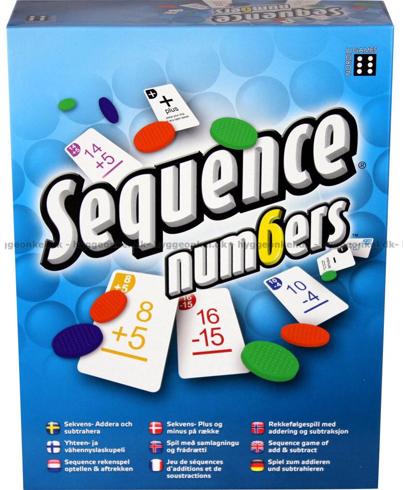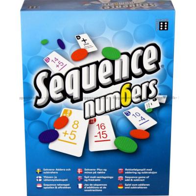 I Sequence Numbers är konceptet detsamma. Dock innehåller korten små räkneekvationer med plus och minus. Facit för en räkneekvation ska matchas med rätt svar på spelbrädet och det är där du ska placera din marker.
