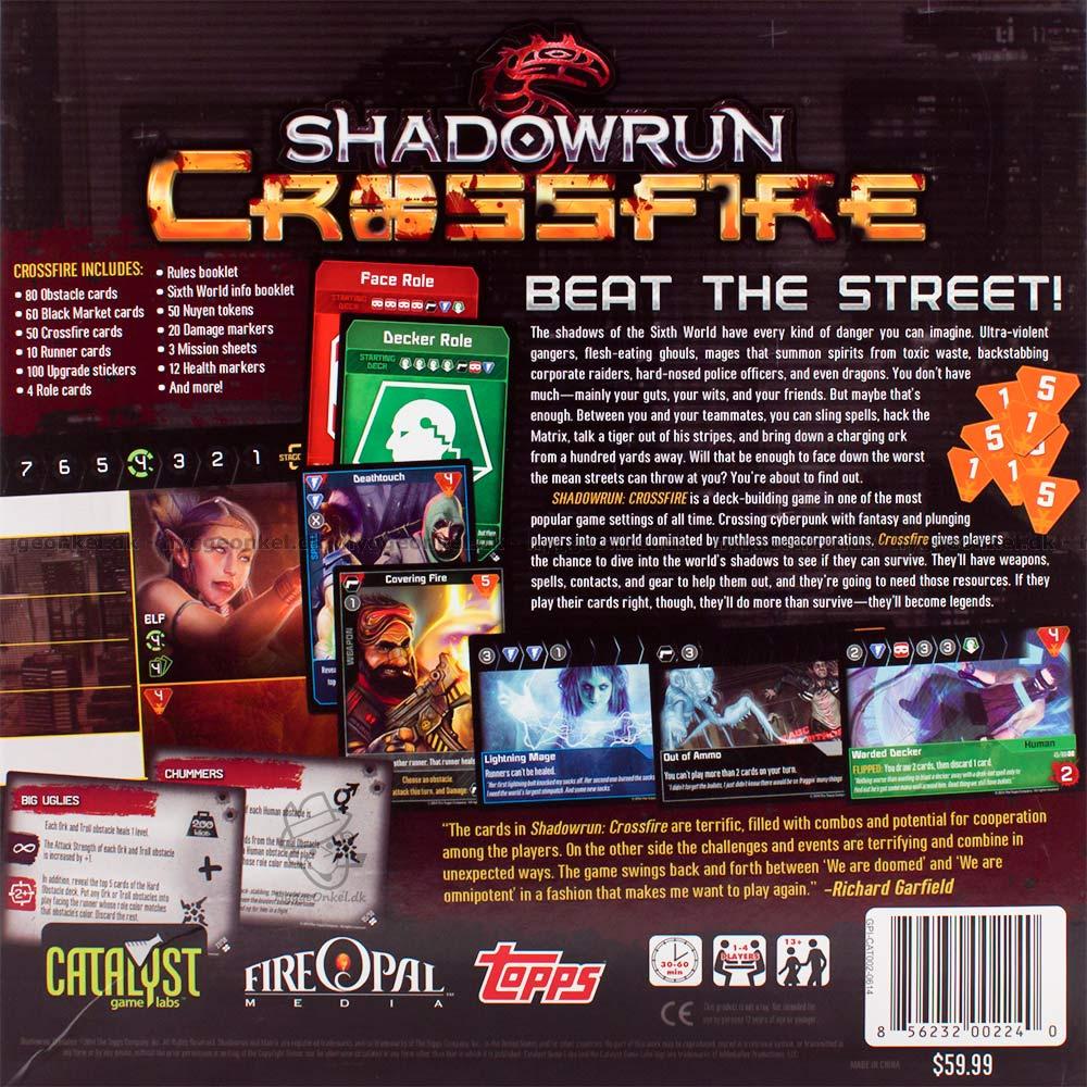 Shadowrun: Crossfire is a cooperative deck-building card game for two to four players set in the gritty, cyberpunk fantasy world of Shadowrun. Play a shadowrunner team and take on tough jobs such as protecting a client who's marked for death, shooting your way out of downtown when a run goes sour, or facing down a dragon. In each game you'll improve your deck with a mix of strategies, while earning Karma to give your character cyber upgrades, physical augmentations, magical initiations, weapons training and Edge.