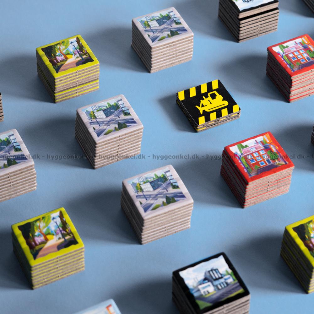 Kuberna bestämmer vilka byggnader, vägar eller parker man kan placera på sin byggplats. Till exempel representerar de grå kuberna vägar och de gröna representerar parker.