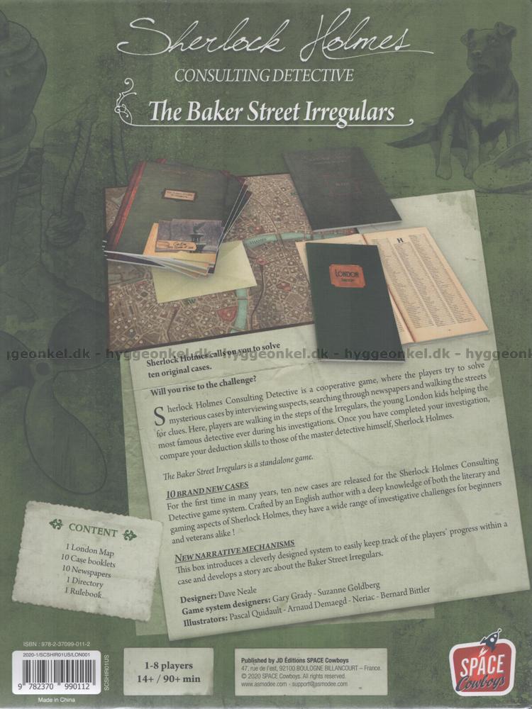 The Baker Street Irregulars är en expansion med tio nya detektivhistorier för Sherlock Holmes Consulting Detective. Var och en av de tio historierna drar dig in i Sherlock Holmes mystiska värld där du ska försöka lösa kriminalfall. Spelet kan spelas solo eller med upp till sju andra spelare. Oavsett vilket kan spännande och kluriga spelomgångar garanteras.