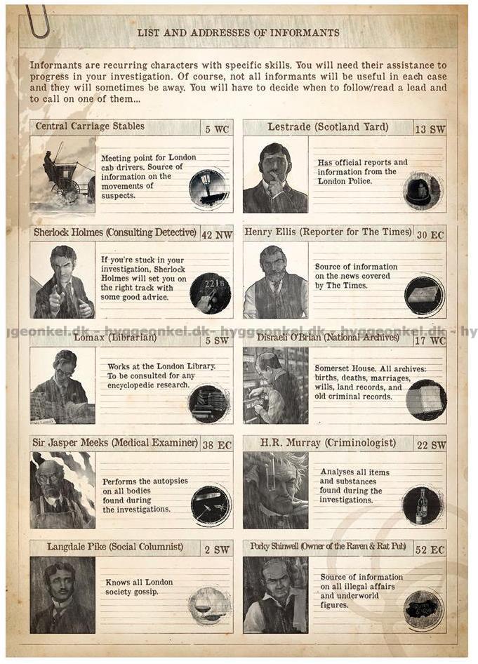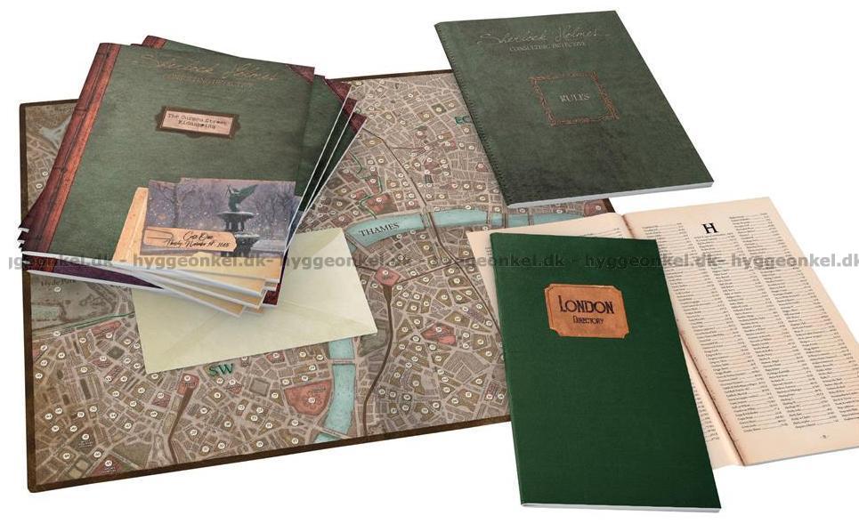 Kartongen innehåller 10 tidningar, karta över London och 10 detektivhistorier.