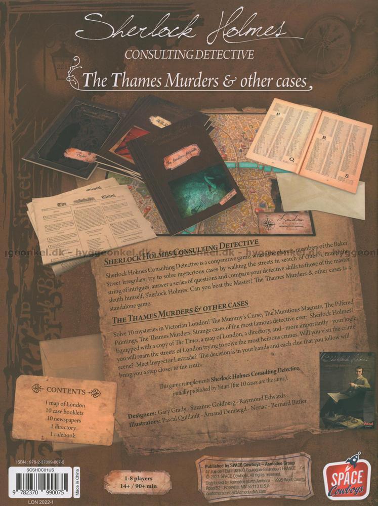 The Thames Murders and Other Cases innehåller tio nya fall för Sherlock Holmes Consulting Detective. Var och en av de tio spännande fallen tar dig in i Sherlock Holmes mystiska värld, där du ska försöka lösa brott. Spelet kan spelas solo eller med upp till sju andra spelare. Du och eventuella medspelare är garanterade spännande och underhållande utmaningar.