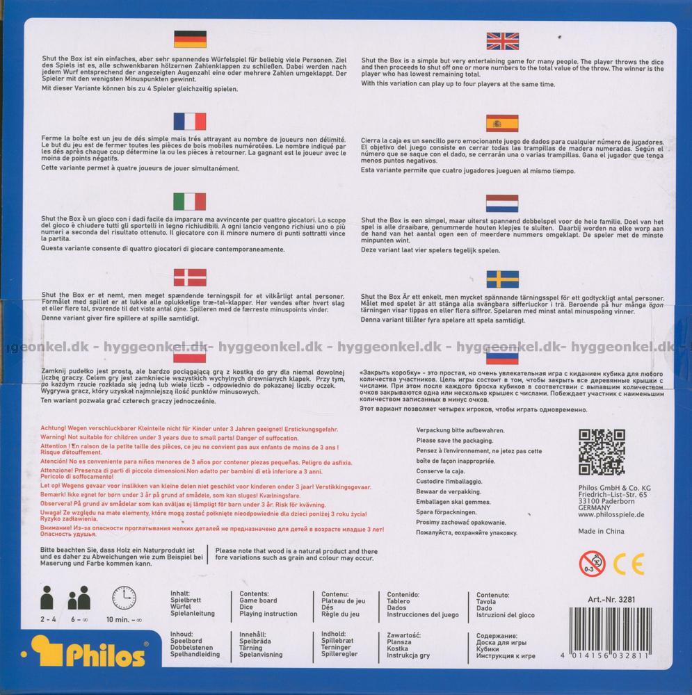 Shut the box är det klassiska spelet där turen spelar en så enormt stor roll. Slå med 2 tärningar och stäng så många klaffar som möjligt. Kan du inte stänga någon, så räknas alla öppna som dina poäng. Det gäller att få så få poäng som möjligt!