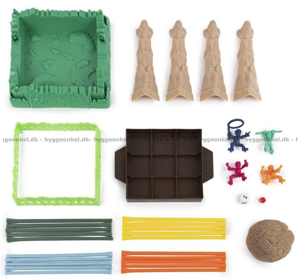 Spelområde i 3D, figurer i plast, kinetisk sand och tärning.