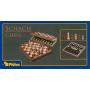Spelet innehåller 32 träpjäser som kan förvaras inne i asken mellan spelomgångarna.