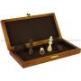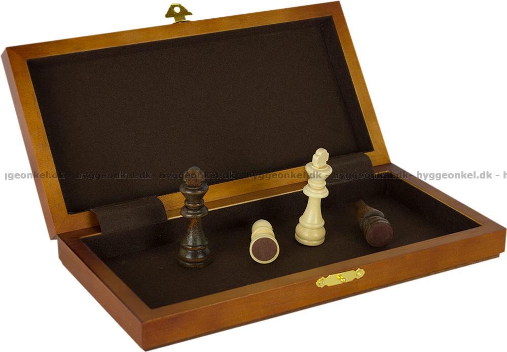Spelet innehåller 32 träpjäser som kan förvaras inne i asken mellan spelomgångarna.