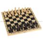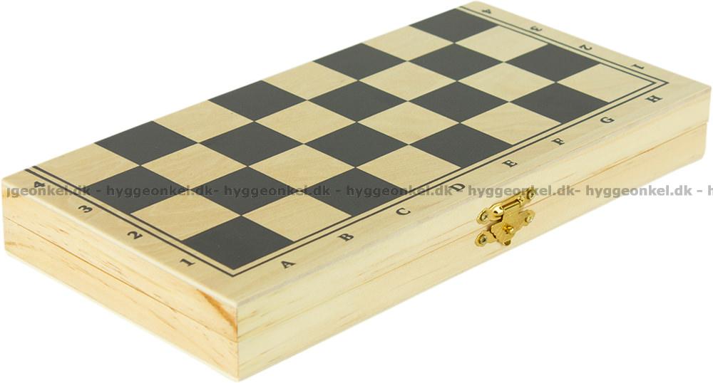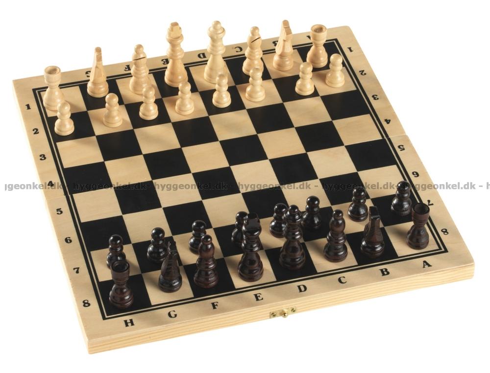 Ett hopfällbart schackspel (mäter 29 x 29 cm) komplett med pjäser som kan förvaras inuti asken när spelet är hopfällt.