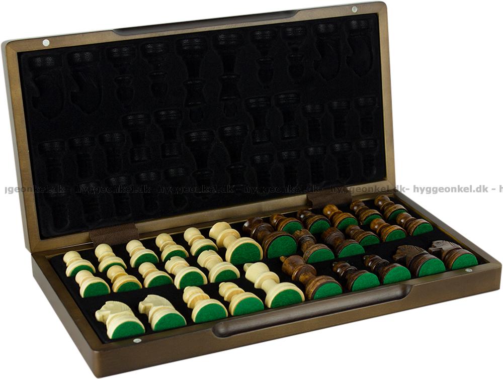 Innehåll: 32 spelpjäser som kan ligga i varsin fördjupning inne i den hopfällbara träasken.
