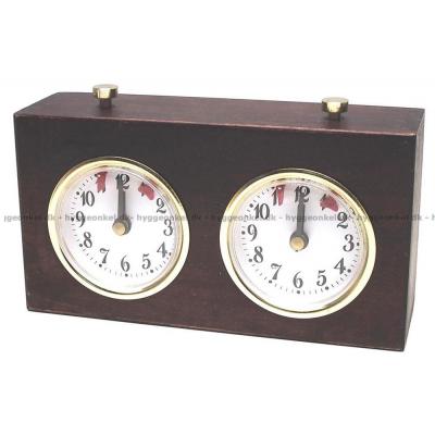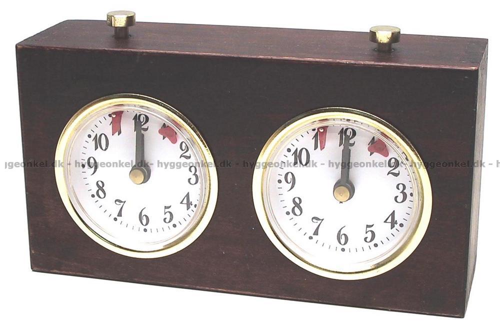 Detta är ett klassiskt analogt schackur i mörkt trä.
