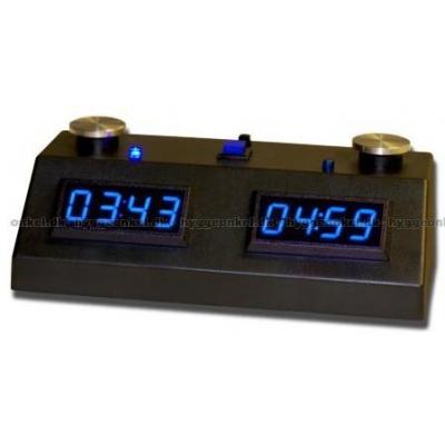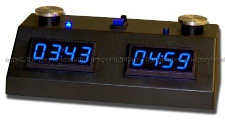 Schackklocka i svart med blå display.