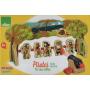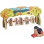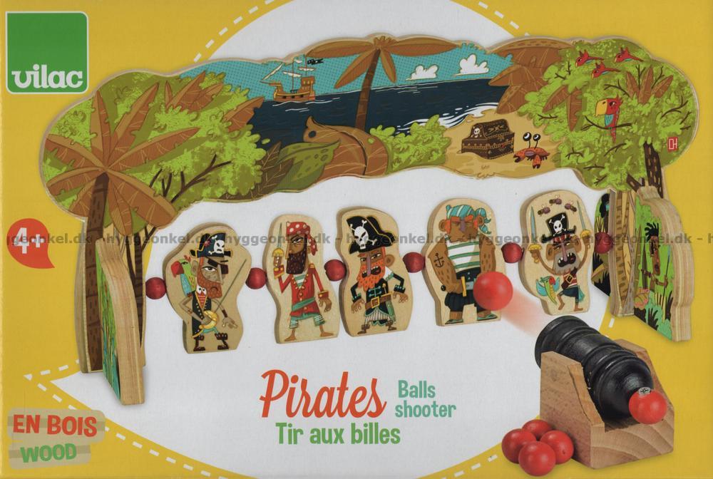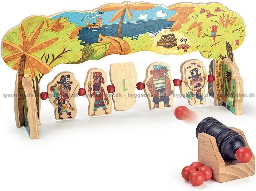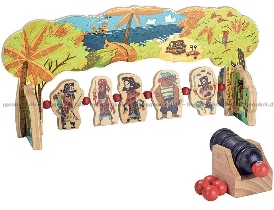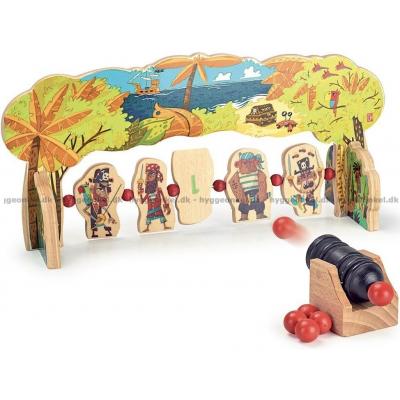 Platta med 5 pirater (plattan är i trä). Den mäter 28 x 13 cm. Därutöver ingår en träkanon (mäter 5 x 6 x 3 cm). I tillägg får du med 5 plastkulor.