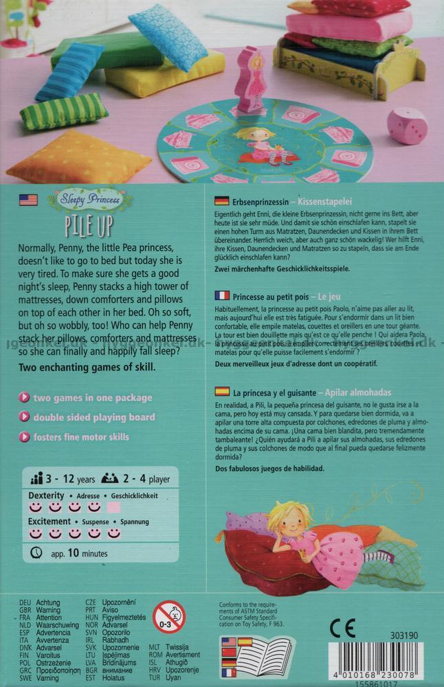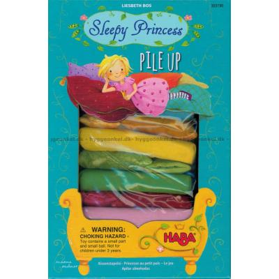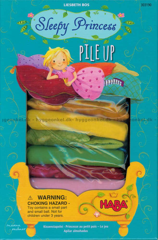 En hög med madrasser, dynor, kuddar, 1 prinsessa-figur och 1 tärning.