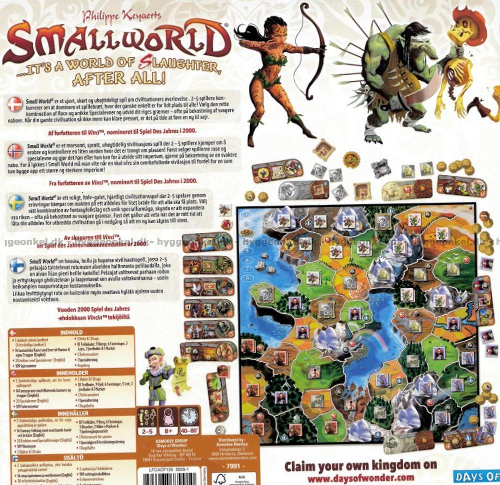 I kartongen hittar du: 2 Small World spelbrädor med print på båda sidor, en trave kort, massor av brickor, banér, mynt och markörer, 1 tärning, 2 referensark och självklart svenska spelregler.