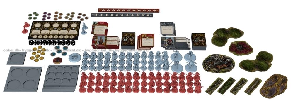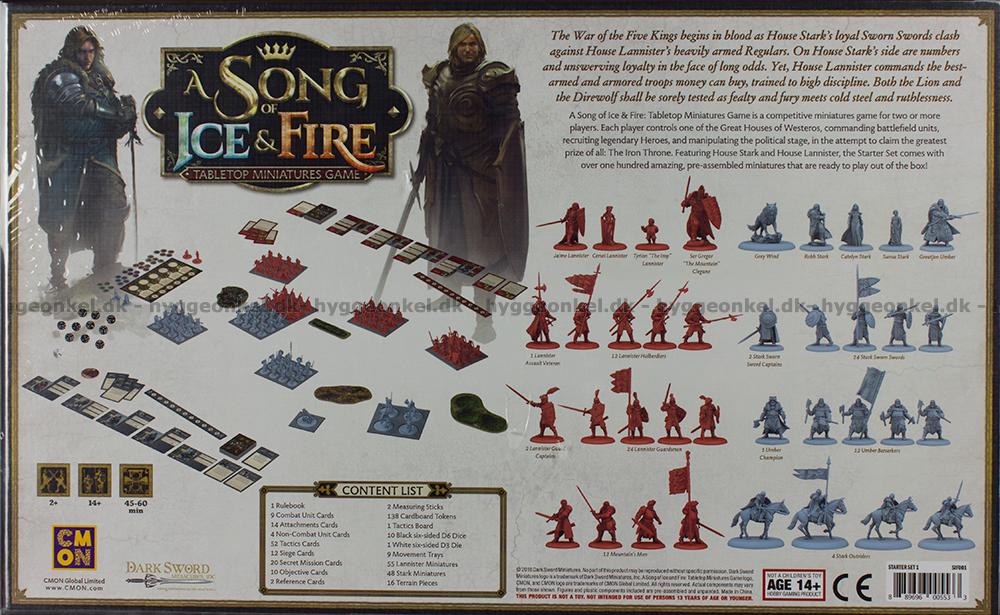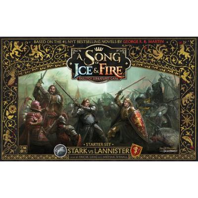 A Song of Ice & Fire är ett kompetitivt miniatyrspel för två eller fler spelare. Varje spelare styr ett av Westeros stora adelshus och har kontroll över deras trupper, legendariska hjältar och det politiska spelet i kampen om Järntronen. Detta nybörjarset innehåller Stark- och Lannister-husen och kommer med fler än 100 vackra figurer som kan användas direkt! De är baserade på originalillustrationer som har skapats till spelet under överinseende av George R.R. Martin och Dark Sword Miniatures, så spelet levererar den bästa upplevelsen för seriens många fans.