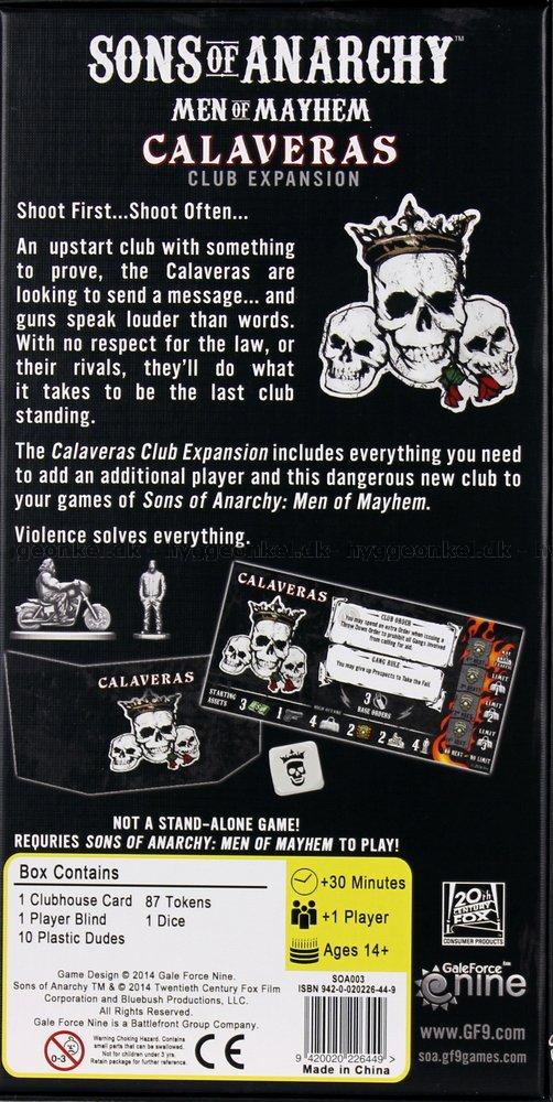 Sons of Anarchy: Men of Mayhem – Calaveras Club Expansion introduces the 'Calaveras' Motorcycle Club to your games of Sons of Anarchy: Men of Mayhem, allowing up to 5 players to play at once (or 6 players if you already own the Sons of Anarchy: Men of Mayhem - Grim Bastards Club Expansion).