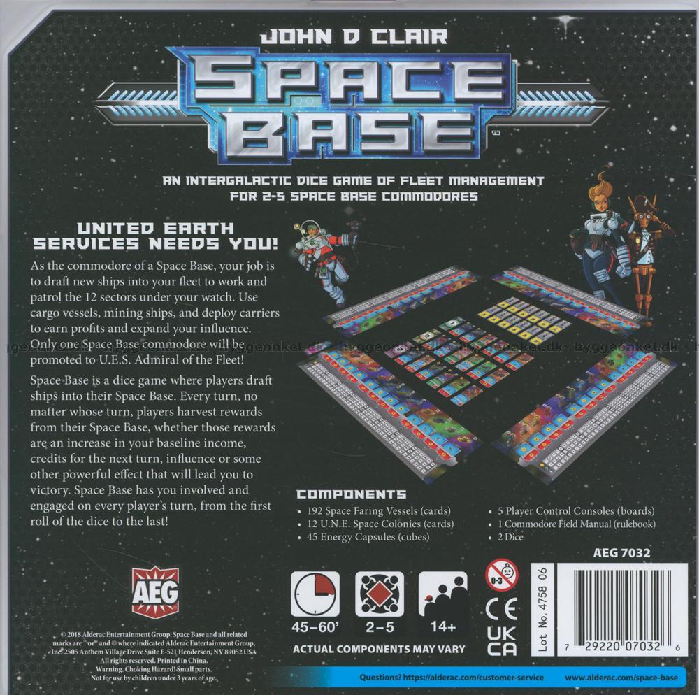 Space Base utspelar sig i rymden. Det är ett spel med tärningar och det handlar om att styra en flotta med rymdskepp.