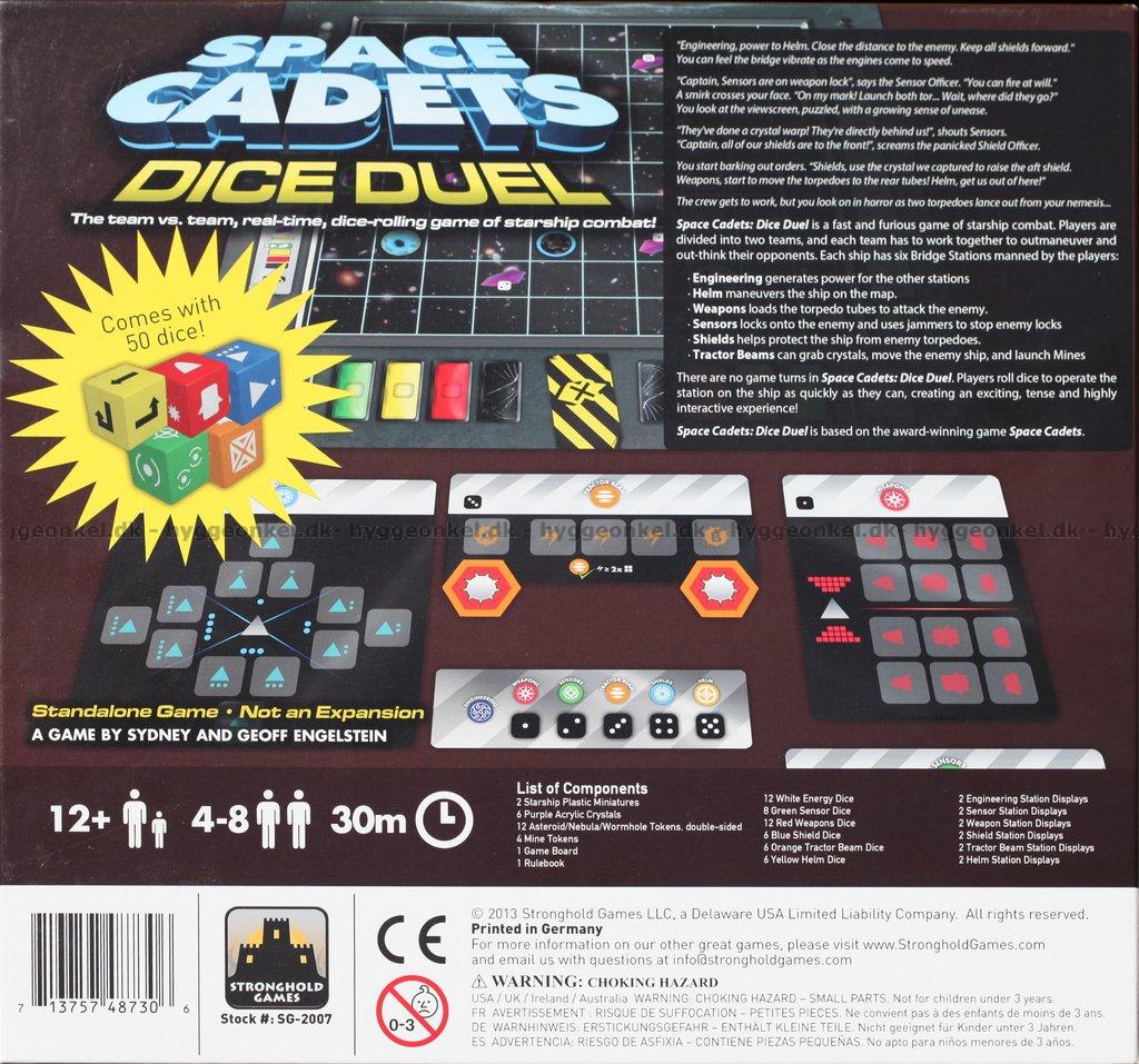 Space Cadets: Dice Duel – the "Team vs. Team, Real-time, Dice-Rolling Game of Starship Combat!" – pits two spaceships against one another in quick-paced combat. The players are divided into two teams, each team playing the crew of a ship and winning or losing together based on how well they perform. The game ends when one side destroys their opponent by causing four points of damage through torpedoes or mines. Each ship has six Bridge Stations: