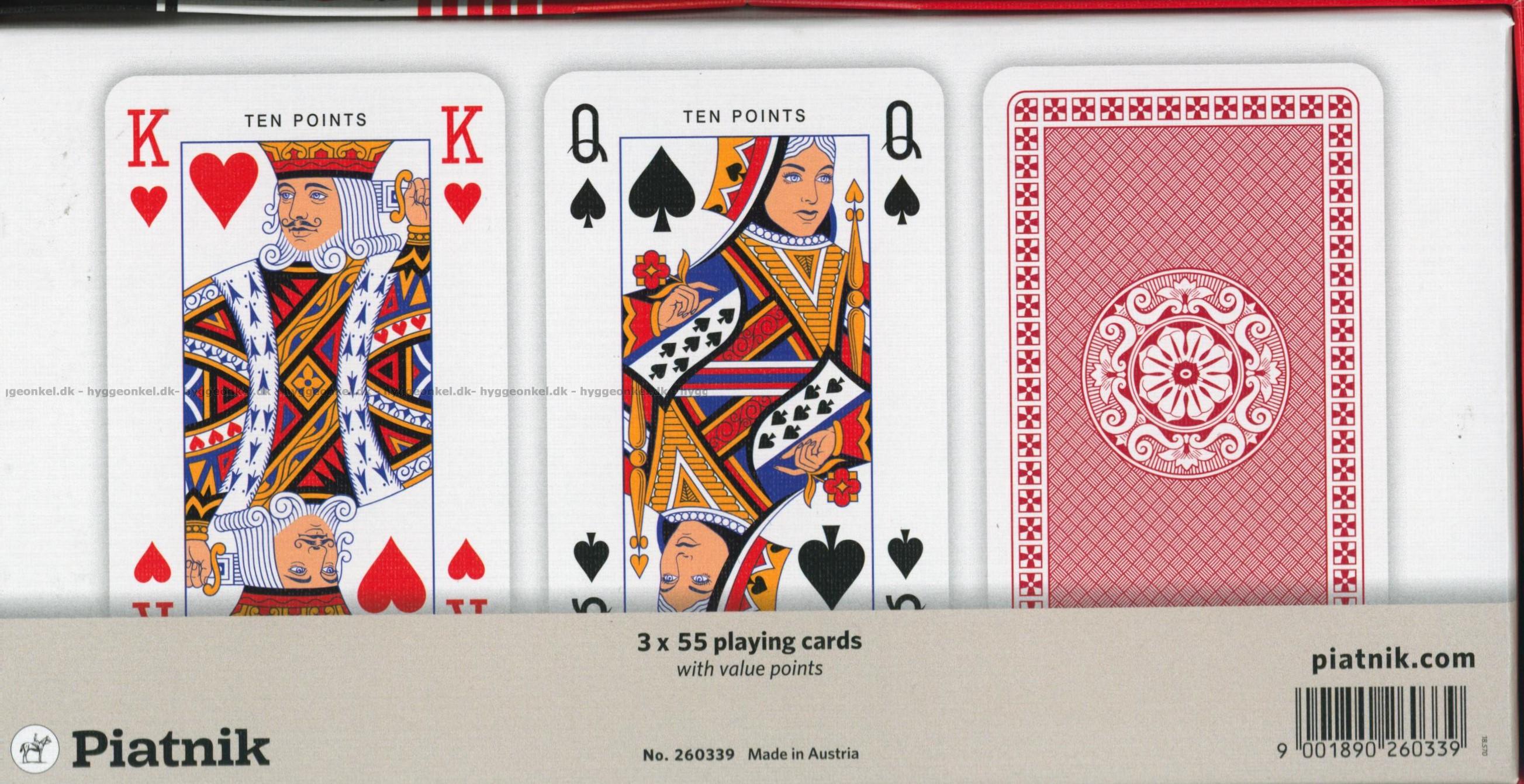 I denna ask får du tre blå kortlekar. I respektive kortlek finns 52 vanliga kort och 3 jokrar. Alla kort har index i alla fyra hörn, så att de kan användas av både höger- och vänsterhänta spelare.