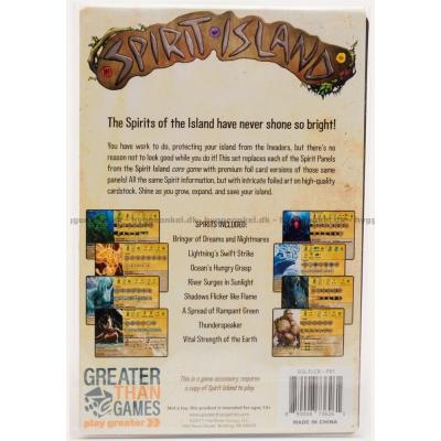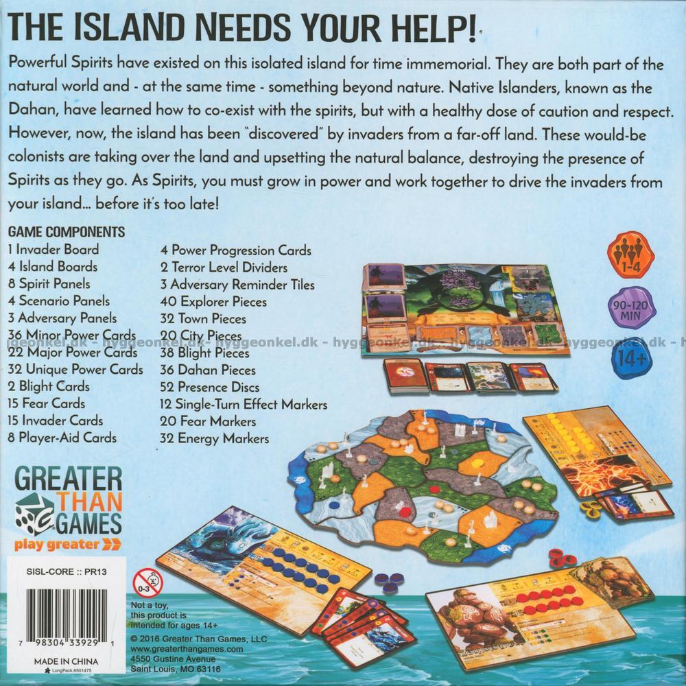 Spirit Island är ett coop-spel för 1-4 spelare, där ni ska rasera de byggnader och den civilisation som kolonisatörer bygger upp på ön. Spelet är designat av R. Eric Reuss i en alternativ version av historien vid omkring år 1700. Spelarna tar rollerna som olika naturandar med naturkrafter. Uppgiften är att skydda ön mot kolonisatörer som sprider död och förstörelse omkring sig. Arbeta tillsammans med de andra andarna och Dahan (öns urinvånare) för att öka er makt och lyckas driva bort kolonisatörerna från ön i detta djupa och komplexa area control-spel!