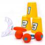 Slangbella i plast, 3 hårda bollar och 3 plastburkar.