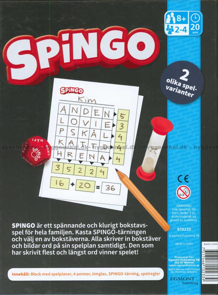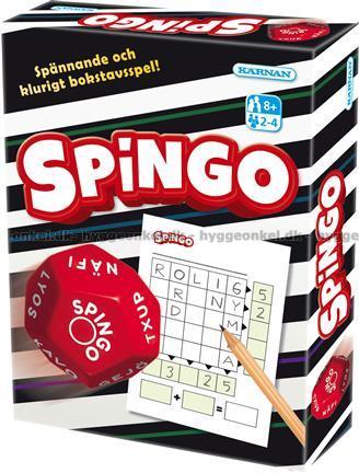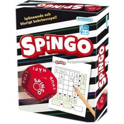 Spingo är ett roligt, klurigt och snabbt bokstavsspel för hela familjen. Det gäller bara att man kan läsa och skriva, så de minsta kan tyvärr inte vara med.