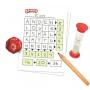Block med spelplaner (5 x 5 rutor), specialtärning, 4 pennor, timglas och spelregler på svenska.