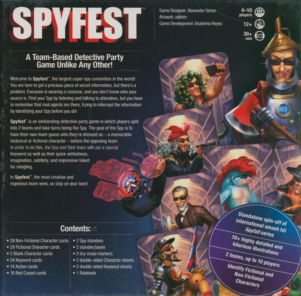 Spyfest kombinerar historieberättande och deduktion i ett underhållande och intensivt sällskapsspel där det mest fantasifulla och uppfinningsrika laget tar hem segern.