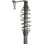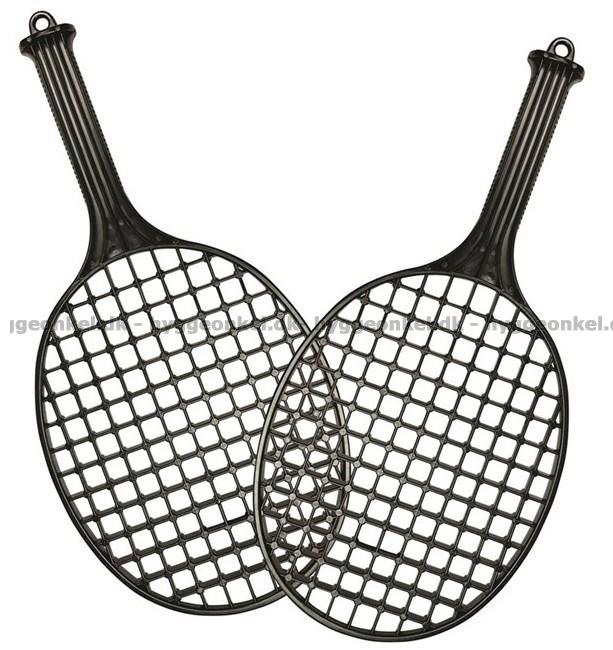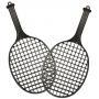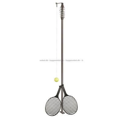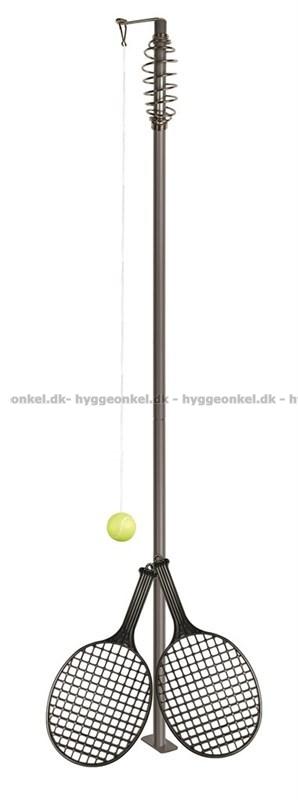 Stången, som är delad i två, 2 racketar, 1 tennisboll förbunden med stången med ett band.