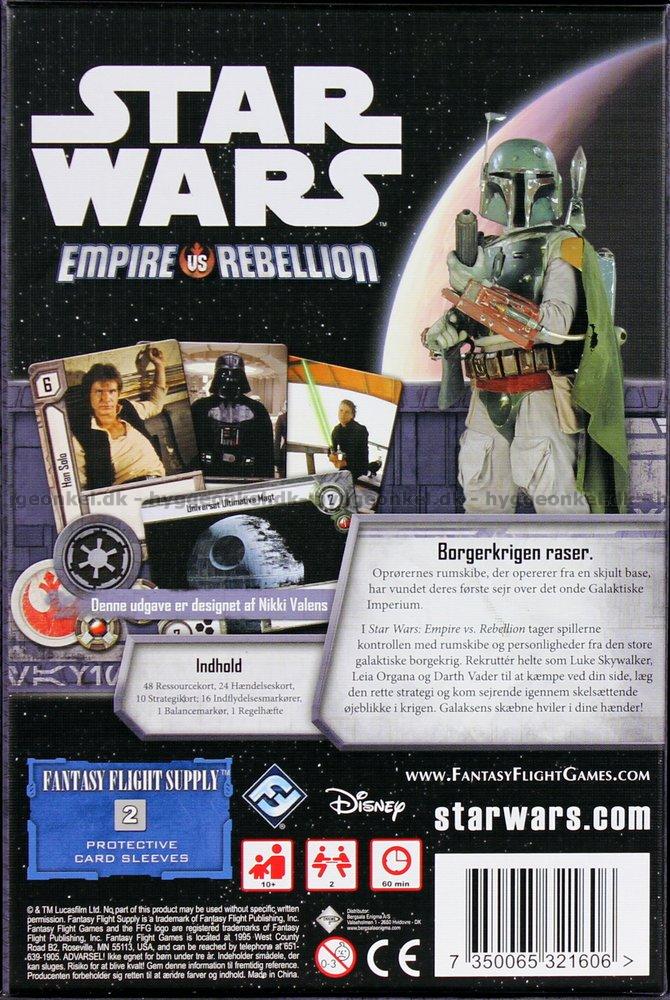 I Star Wars: Empire vs. Rebellion tar två spelare kontrollen över var sin sida i konflikten. I varje spelrunda kommer utfallet av en viktig händelse att vara centrum för en både politisk och militär kamp.