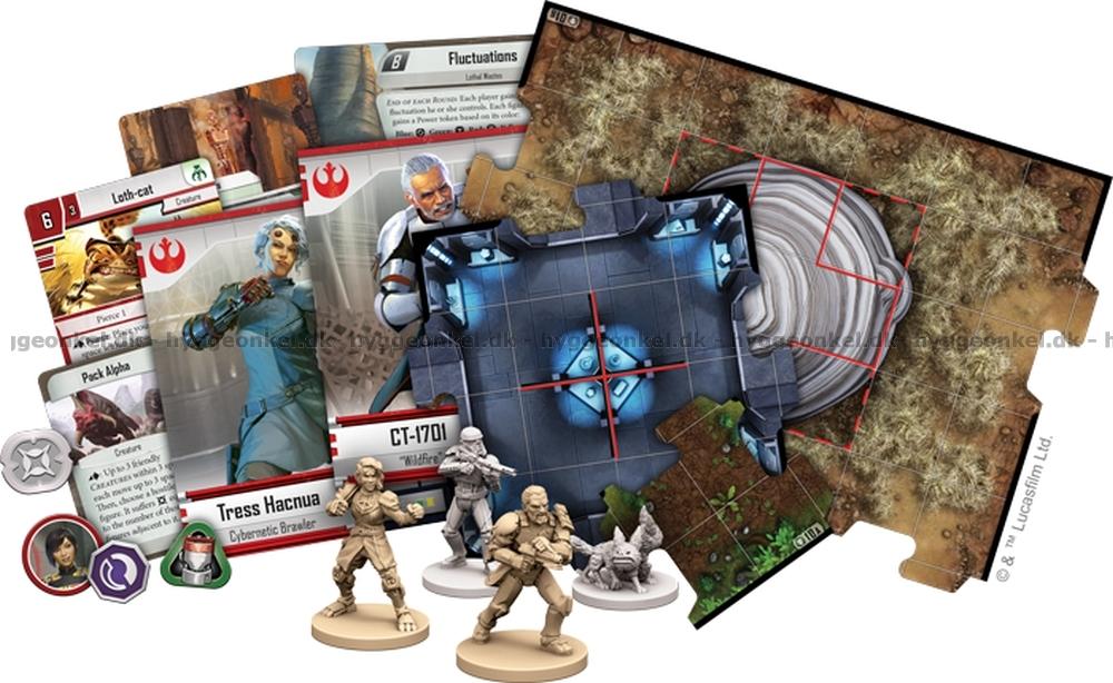 Asken innehåller plastfigurer, kort, spelplattor, marker och självklart också spelregler (på engelska).