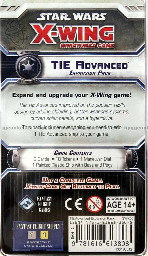Den här expansionen innehåller allt du behöver för att addera en TIE Advanced x1 till din samling miniatyrer. Expansionen innehåller 1 miniatyrskepp, 1 manöverhjul, 9 kort och 18 marker.