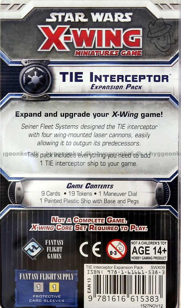 Imperial players can add a lethal starfighter to their X-Wing squadrons with the Star Wars: X-Wing Miniatures Game - TIE Interceptor Expansion Pack. The finest mass-produced starfighter of its time, the TIE Interceptor excels at dogfighting thanks to its heightened maneuverability, increased speed, and four wing-mounted laser cannons. With its detailed miniature, two upgrades, and six skillful new pilots that include the renowned Soontir Fel, the TIE Interceptor Expansion Pack creates exciting opportunities for all Imperial X-Wing players!