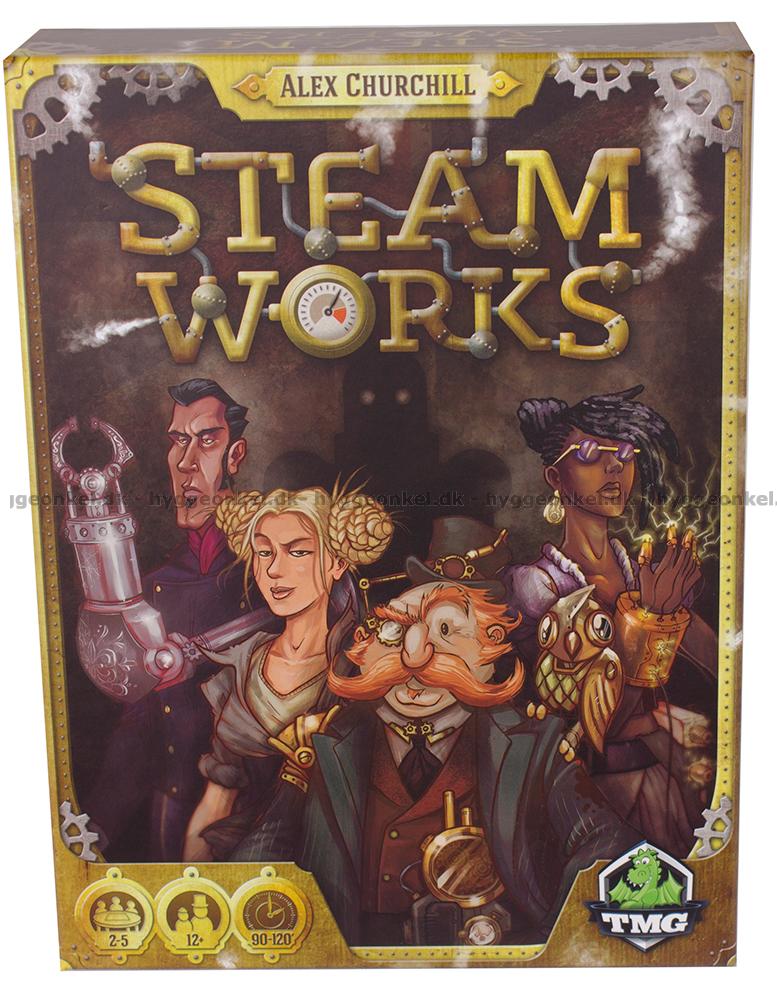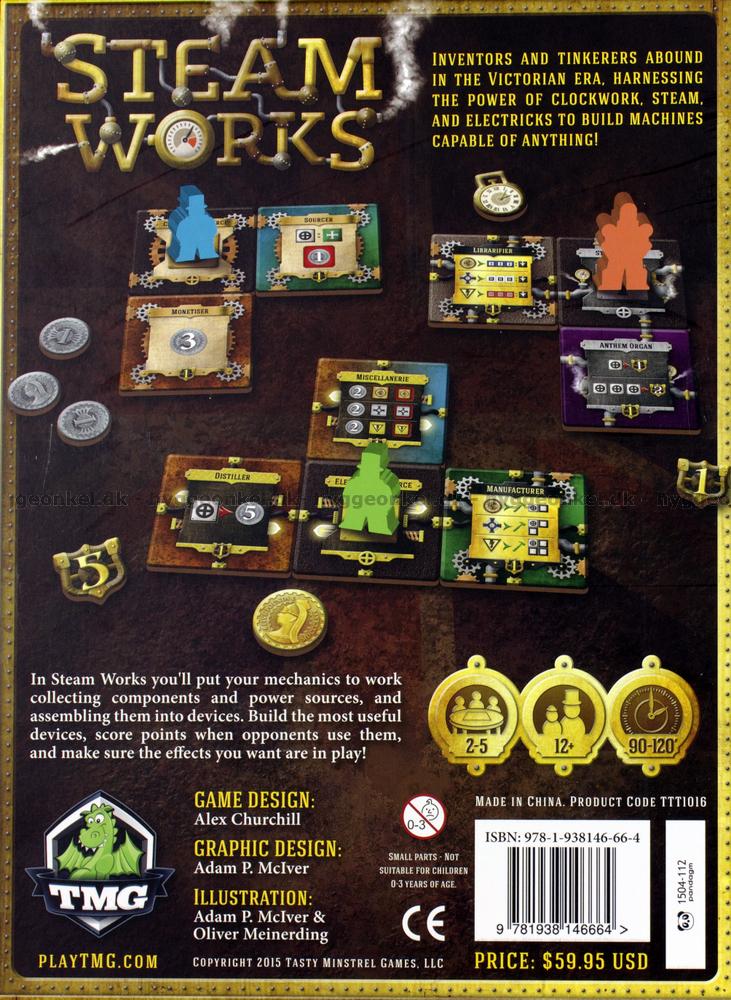 In the steampunk worker placement game Steam Works, you'll put your mechanics to work collecting components and power sources, then you'll literally build devices by assembling those sources and components. What's more, those devices in turn become action spaces for other players to use!