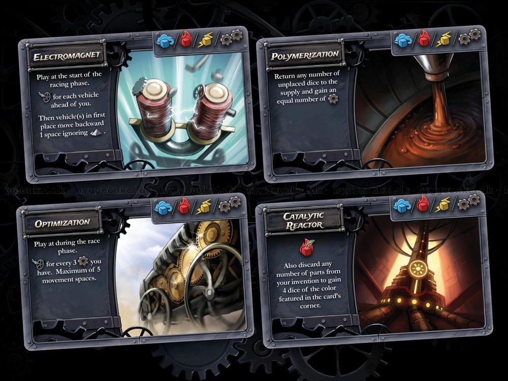 Kartongen innehåller en stor mängd tärningar, kort och pjäser.