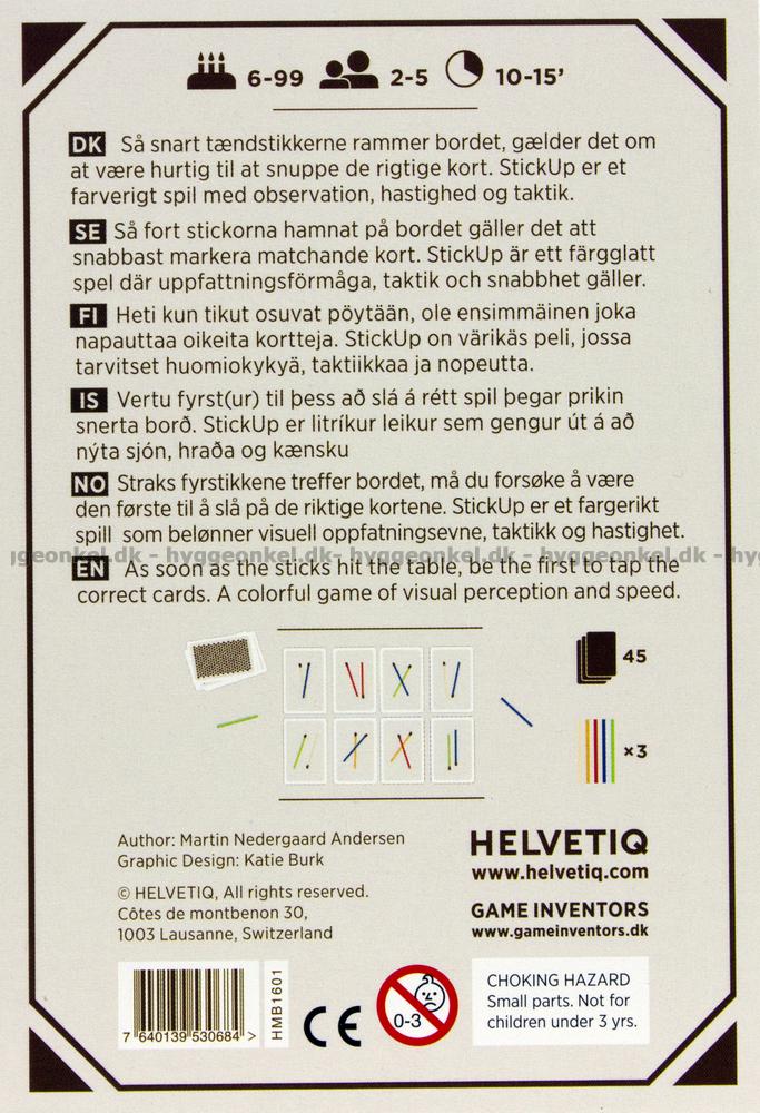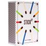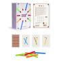 På bordet ligger en hög med kort som visar olika kombinationer av 2 stycken färgade tändstickor.