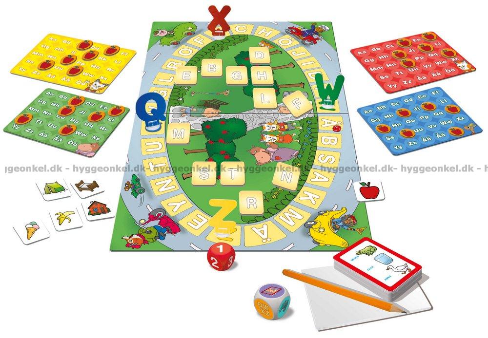 50 ort, 2 trätärningar, 4 spelpjäser med fötter, block, penna, 25 bokstavsbrickor, 36 poängbrickor, 4 alfabetsplattor samt regler.