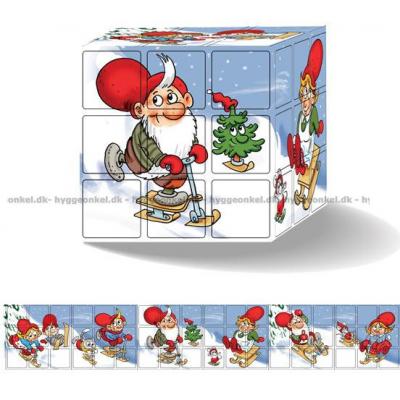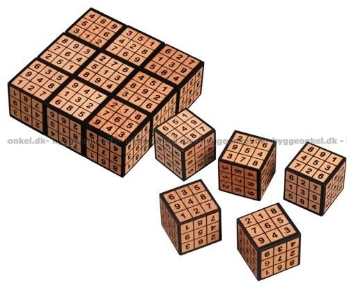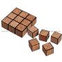 Här får du 9 kuber i trä. Varje tärning mäter 4 x 4 x 4 cm.