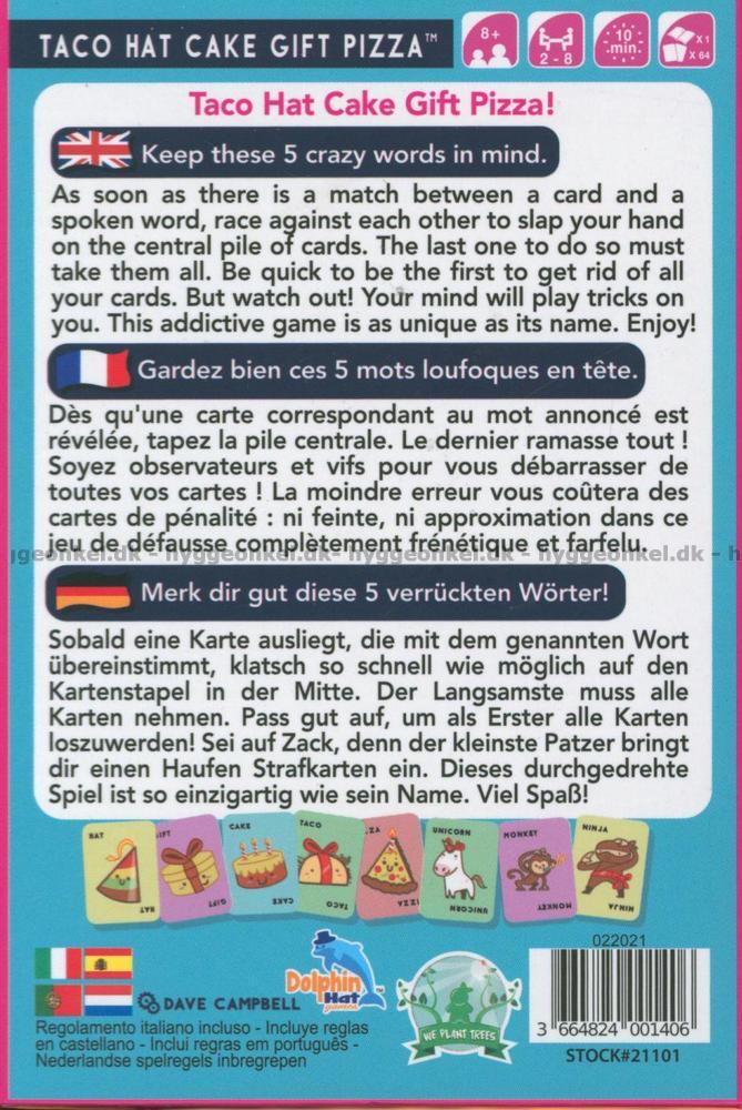 I detta kortspel ska spelarna turas om att säga TACO, HAT, CAKE, GIFT och PIZZA.
