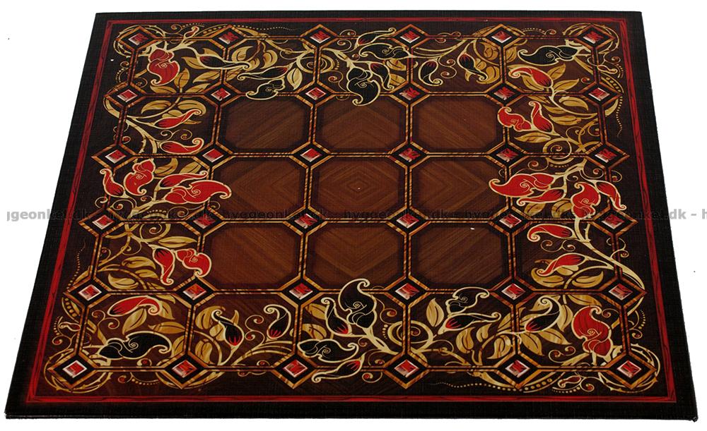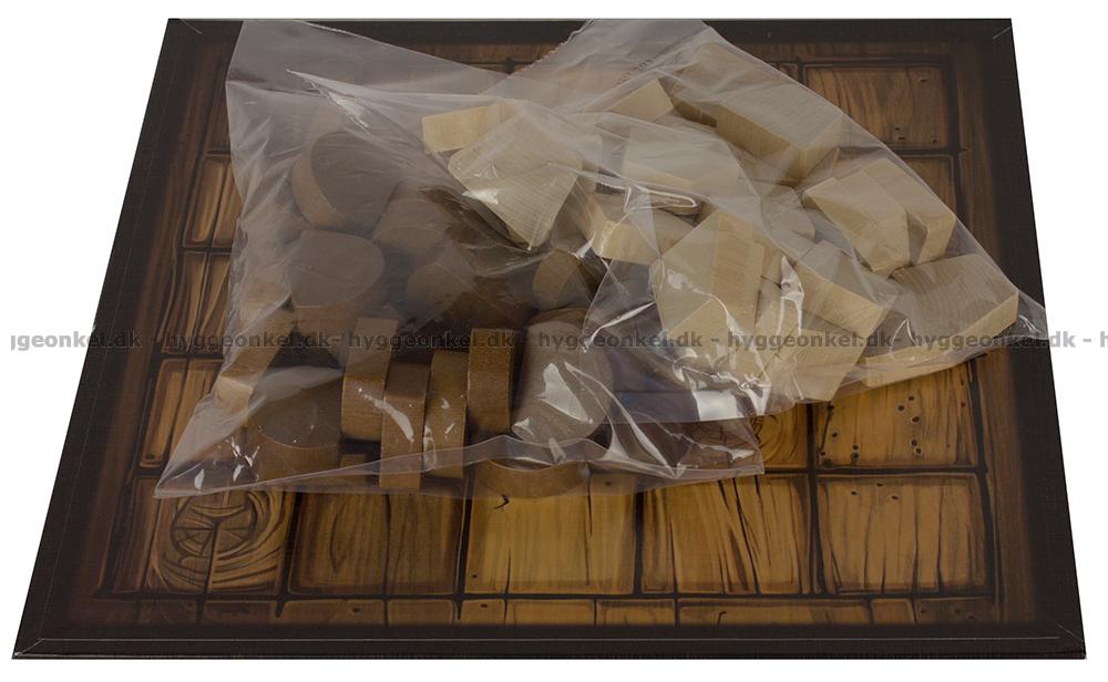 1 dubbelsidigt bräde (i kartong) och 62 träpjäser.