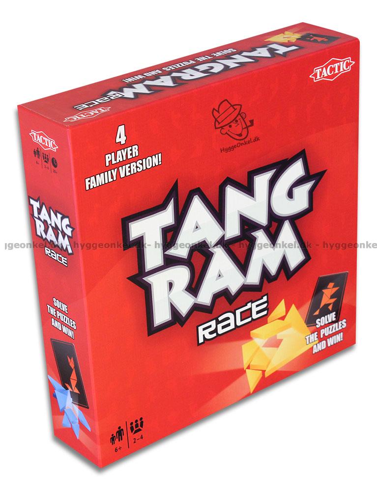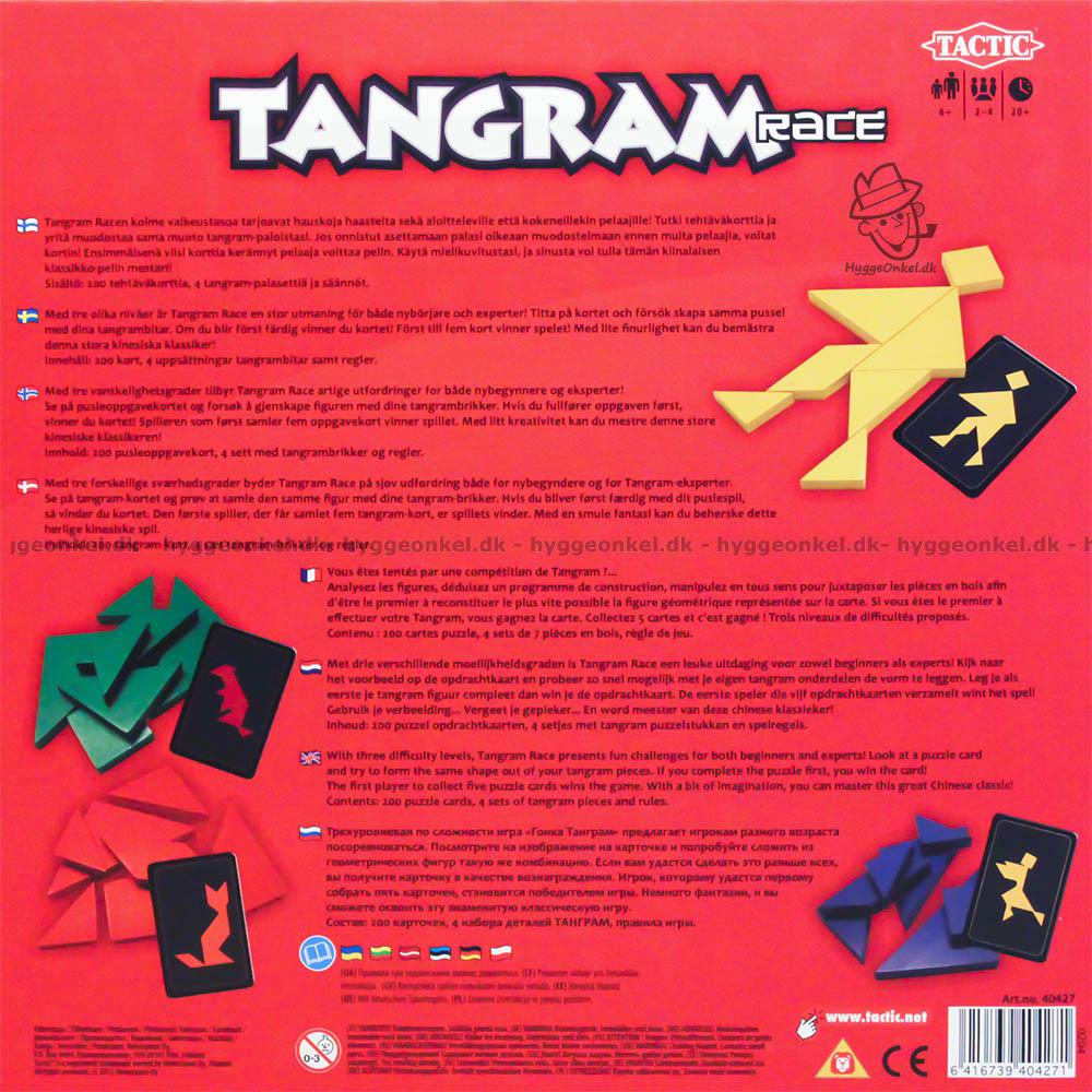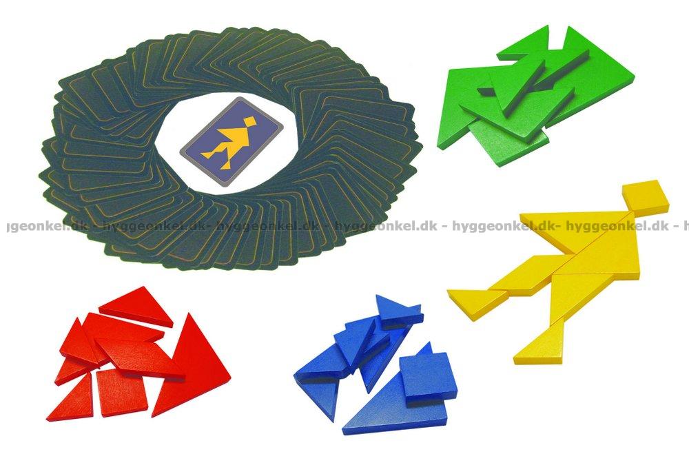Innehåll: 200 kort, 4 uppsättningar tangrambitar samt regler.