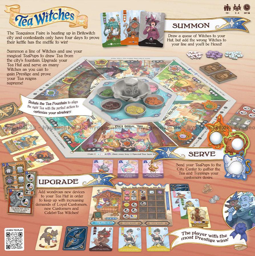 I inkallningsfasen bygger ni upp en kö av häxor genom att vända kort från er lek, samtidigt som ni måste undvika att drabbas av en förbannelse om för många häxor från samma orden dyker upp. I serveringsfasen skickar ni era te-hjälpare till olika butiker i stadens centrum för att vrida tefontänen, fylla och lagra te, köpa förbättringar eller aktivera särskilda förmågor, innan ni serverar te till häxor och kända gäster för att få belöningar och öka ert lojalitetsspår. Under spelets gång kan ni investera i skyddande förbannelseskydd, särskilda teer och förbättringar som stärker er bod och ger nya sätt att skapa resurser och prestige på.