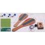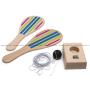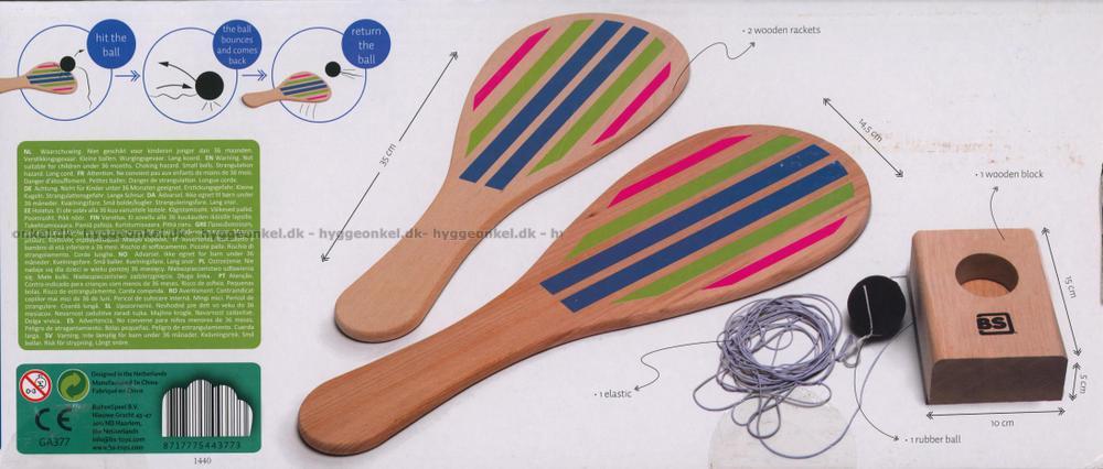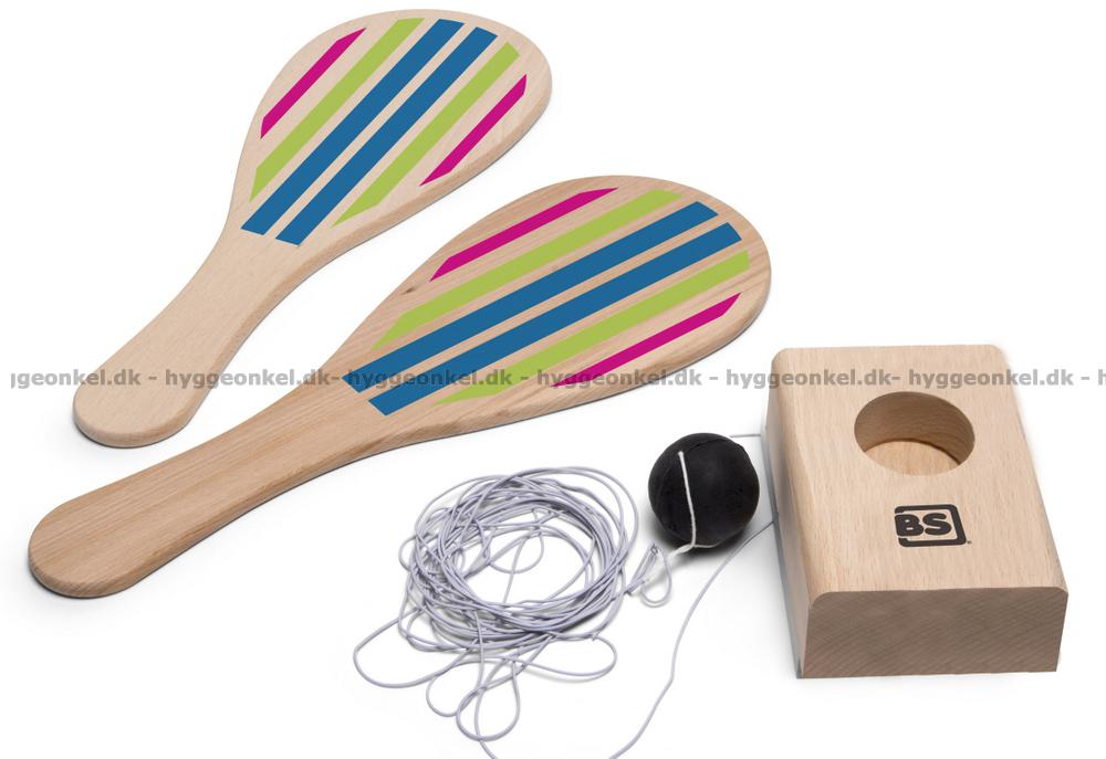 Block i trä som ligger stabilt mot marken (mäter 10 x 15 x 5 cm) med elastiskt snöre och boll. 2 racketar i trä.
