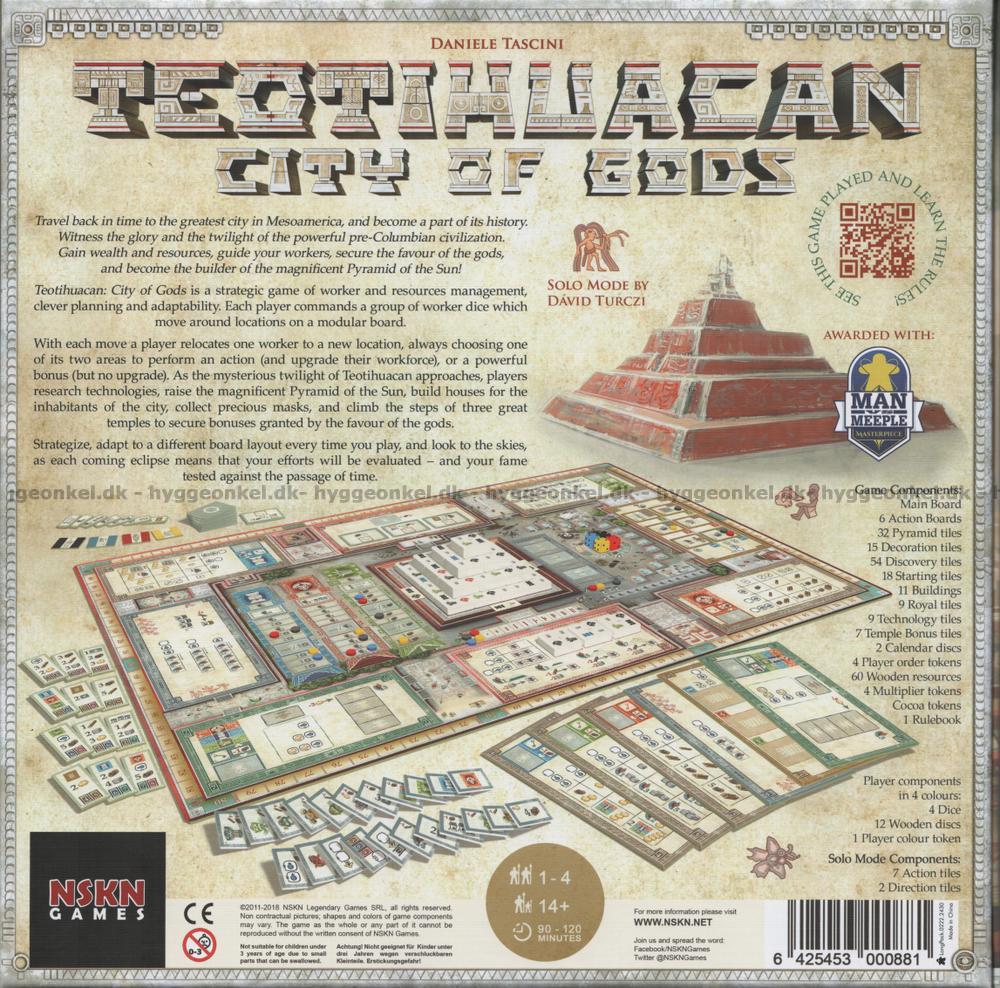 I Teotihuacan: City of Gods har varje spelare en samling tärningar. Dessa motsvarar spelarnas arbetskraft och denna växer genom hela spelet. När det är din tur att agera, flyttar du runt en arbetare på det modulära brädet och väljer ett av två områden på det fält du landar på. Det ena området ger dig en handling (och en arbetaruppgradering) medan det andra ger dig en stor bonus (men ingen uppgradering).