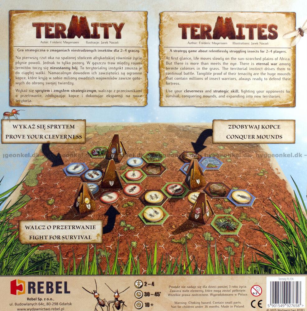 Battles are fought on various terrain tiles which affect efectivness of your Termites. During player turn each of them can put one unit on the board, move and attack other players unit or mounds.