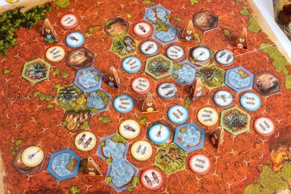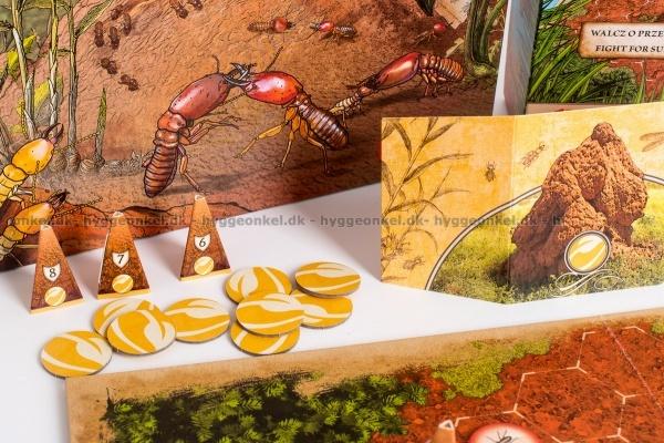 Each player has 18 tokens representing units of fighting insects. A unit’s combat strength depends on the number of termites printed on it as well as the strength of their caste. There are 4 castes:
