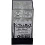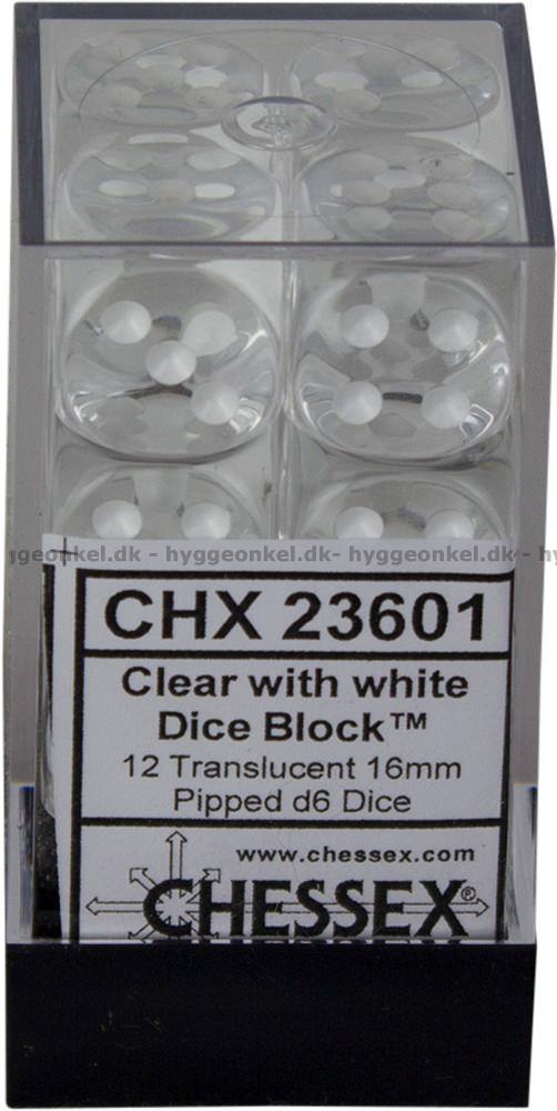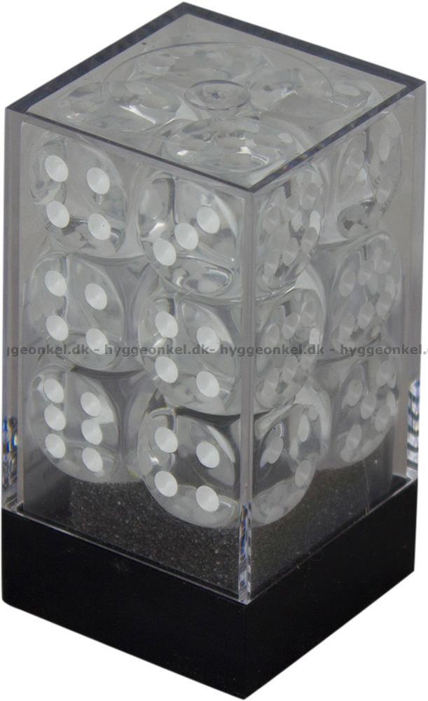 Här får du 12 stycken genomskinliga 6-sidiga tärningar med vita prickar. Sidorna mäter klassiska 16 mm.